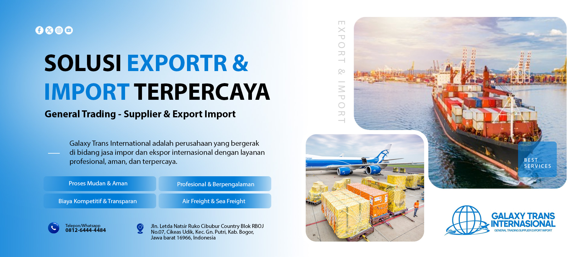 PT Galaxy Trans International adalah perusahaan yang bergerak di bidang jasa impor dan ekspor internasional, general trading, serta supplier yang berkomitmen memberikan layanan logistik global yang aman, mudah, dan terpercaya. Kami hadir untuk membantu pelaku usaha, distributor, hingga individu dalam memenuhi kebutuhan pengiriman barang dari luar negeri ke Indonesia maupun sebaliknya dengan sistem door to door yang praktis dan efisien.